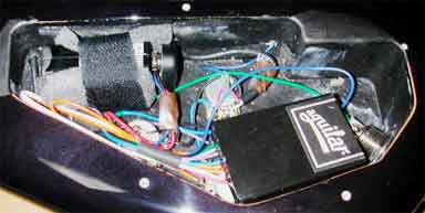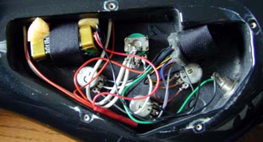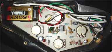 Many pre-Kramer Spectors used Haz Lab preamps. A battery cable pin made by alumite is easy to make exchange be hardening very much. Four dumpy emerald-colored insulation resin parts are outstanding. (I don't know a lot about electric knowledge...) The board marked by a red marker on volume pot is seel well. And, It's a characteristic that only the left balancer pot is square. A cylindrical parts (an aluminum electrolysis condenser) of the lower left, colored by light blue. Conductive shielding paint is not painted many cavities. Only copper foil that it put on a base. But, it's terrible that there are not most of the noises.
